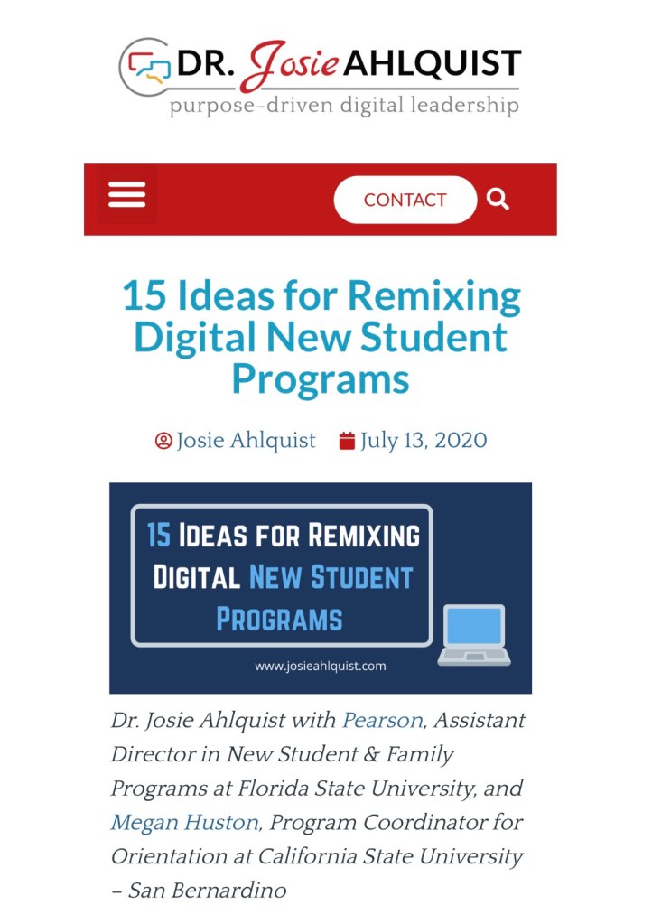 Spring Break brought a whole new set of challenges to Orientation, Transition, & Retention (OTR) professionals. As COVID-19 began to spike and our university campuses closed, I sat in several webinars hosted NODA, corresponded with my colleagues and friends from across the nation via GroupMe and Facebook groups, & even had the opportunity to host a NODA webinar on Putting Orientation Leader Training Online with Canvas. Reimagining how we were going to transition our orientation programs online seemed like an impossible tasks. As we planned the logistics of our New ‘Nole Virtual Orientation, we referenced Dr. Ahlquist’s 30 Ideas for Digital-Friendly New Student Orientation. While slightly dated, it provided us the spark we needed to ignite our ideas and innovation. It was a pleasure to partner with Dr. Ahlquist to provide some updates as we near the conclusion of our orientation summer season. Read more here: 15 Ideas for Remixing Digital New Student Programs